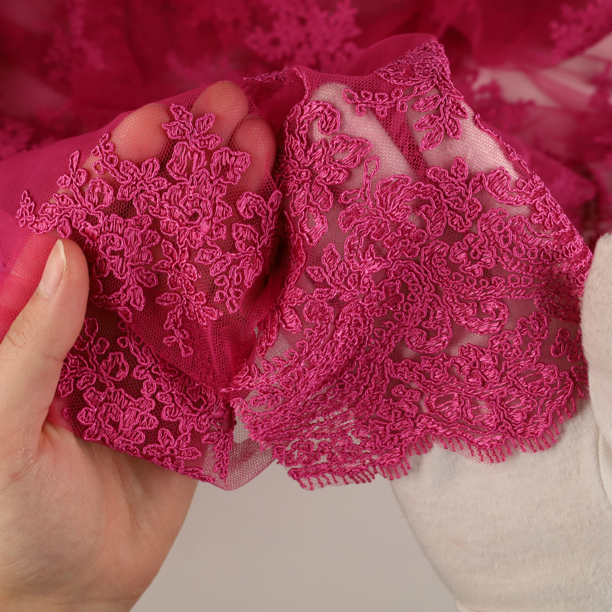 • Utilizzo: Spiccata attitudine per abiti strutturati e sovrapposizioni su basi come raso, mikado o tulle.