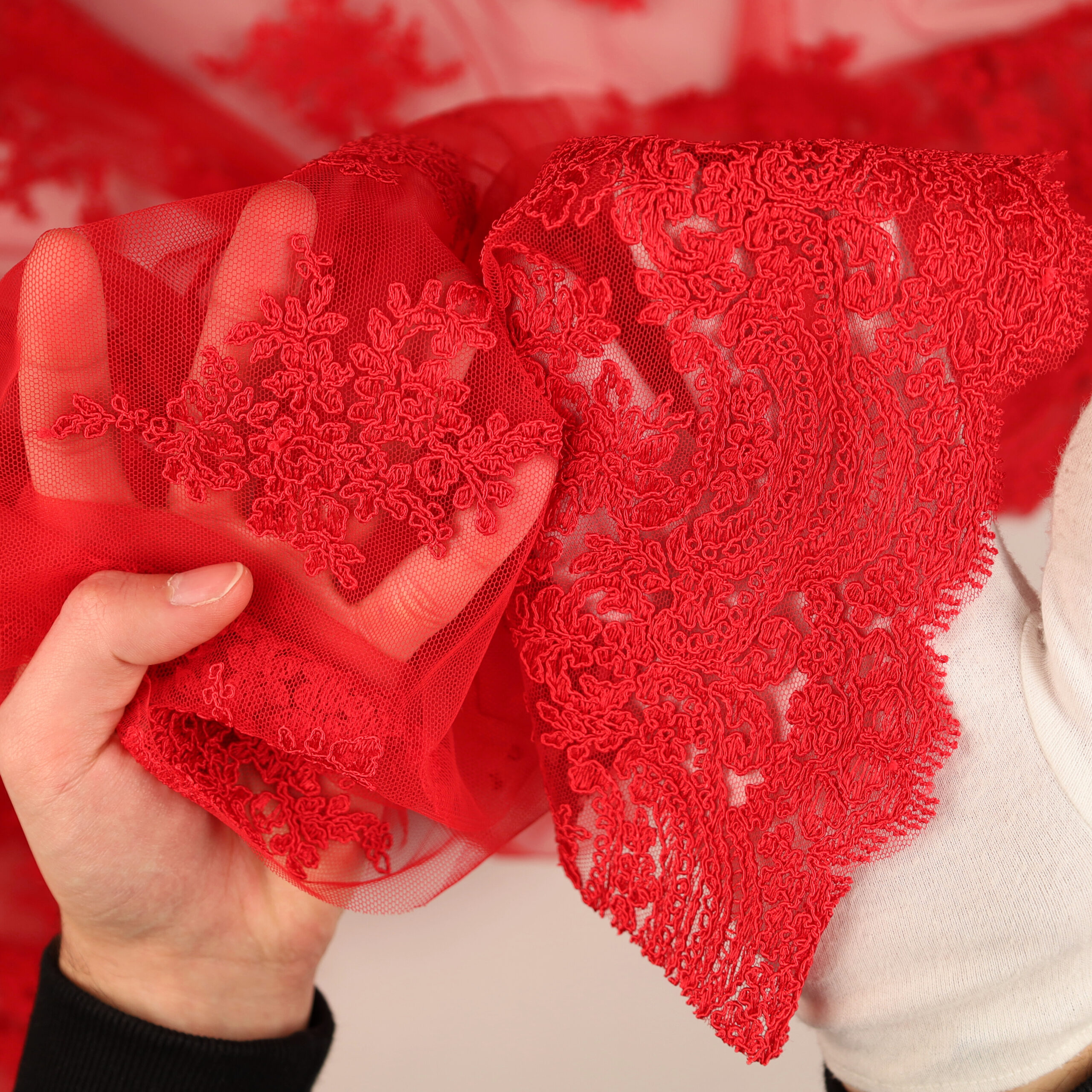 • Utilizzo: Spiccata attitudine per abiti strutturati e sovrapposizioni su basi come raso, mikado o tulle.