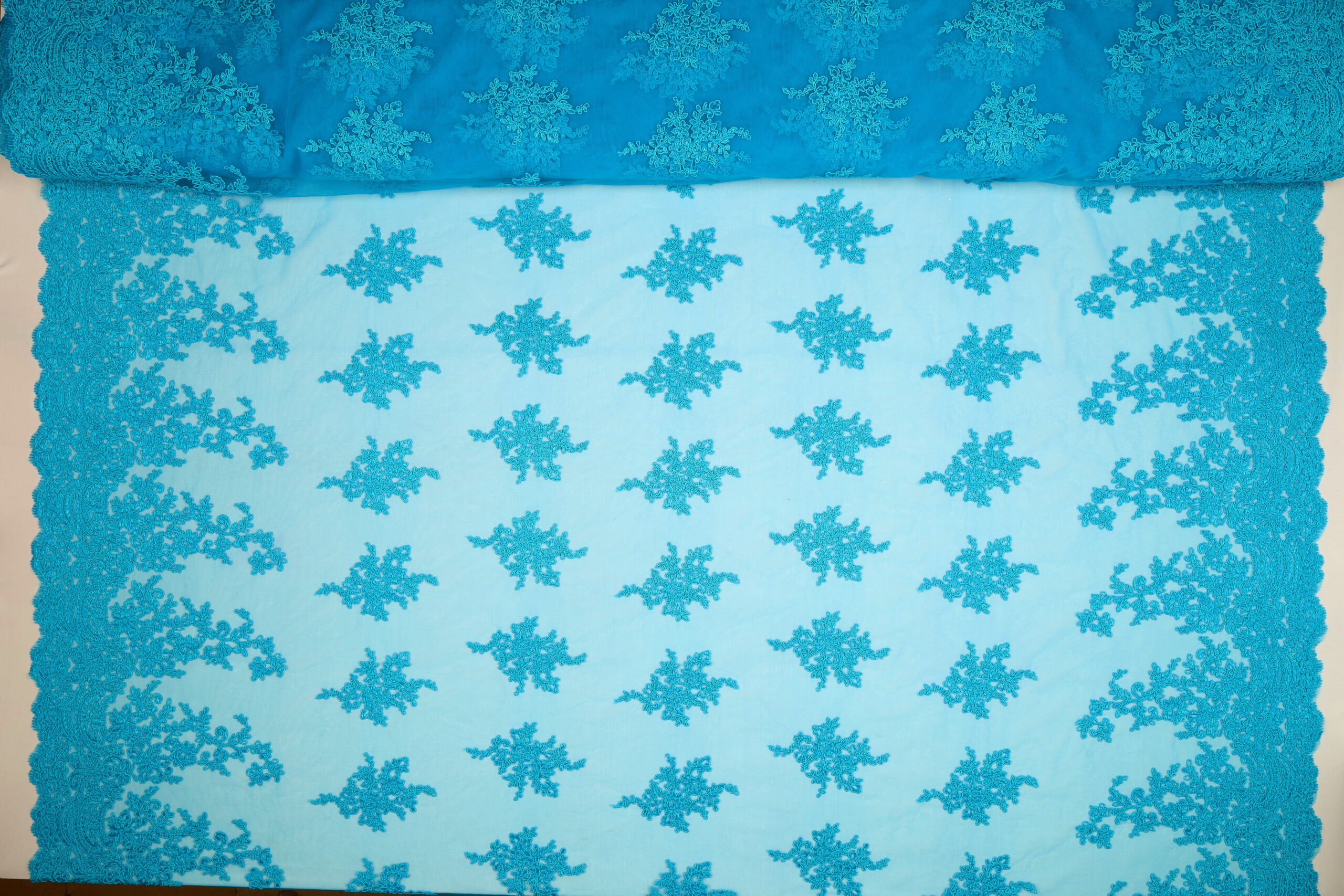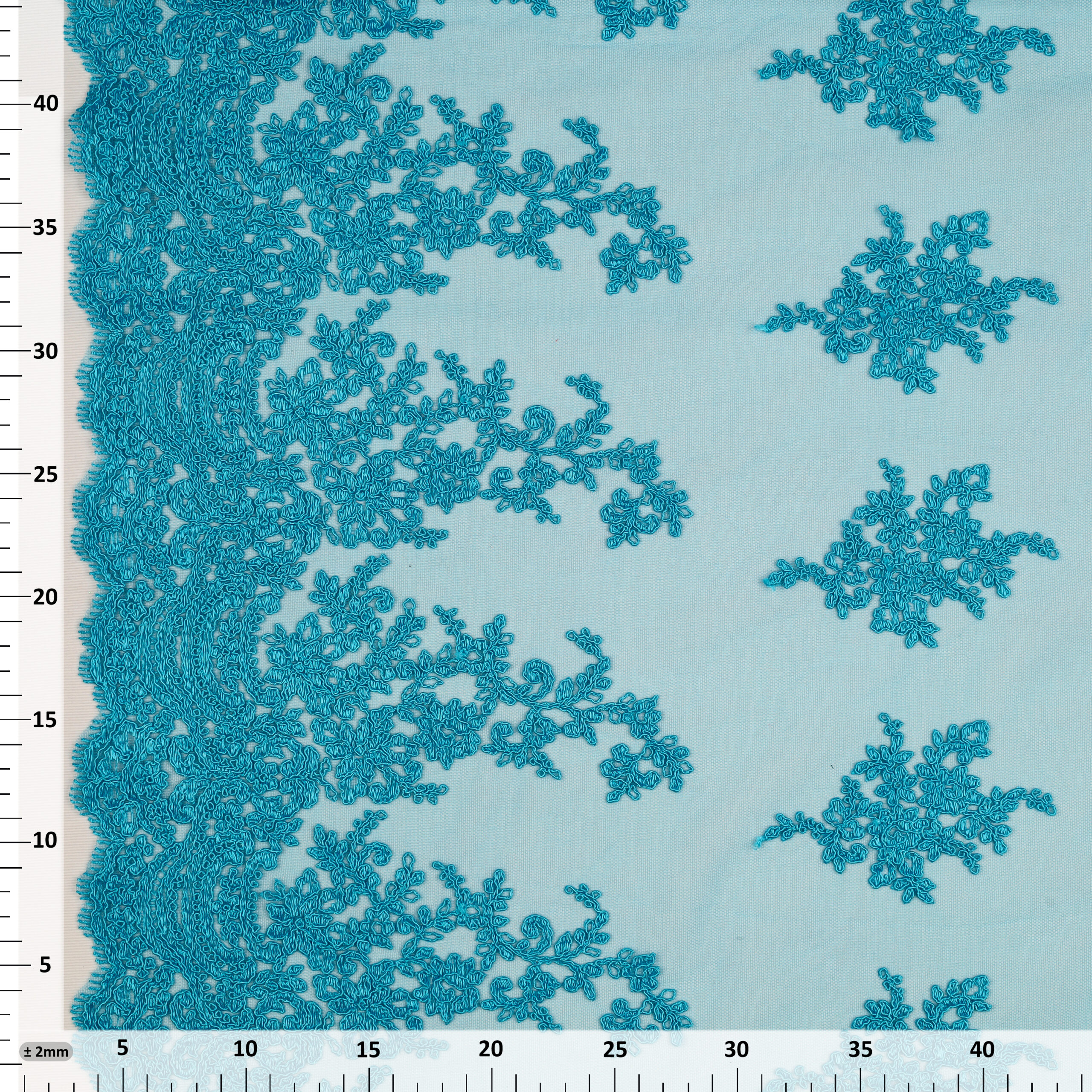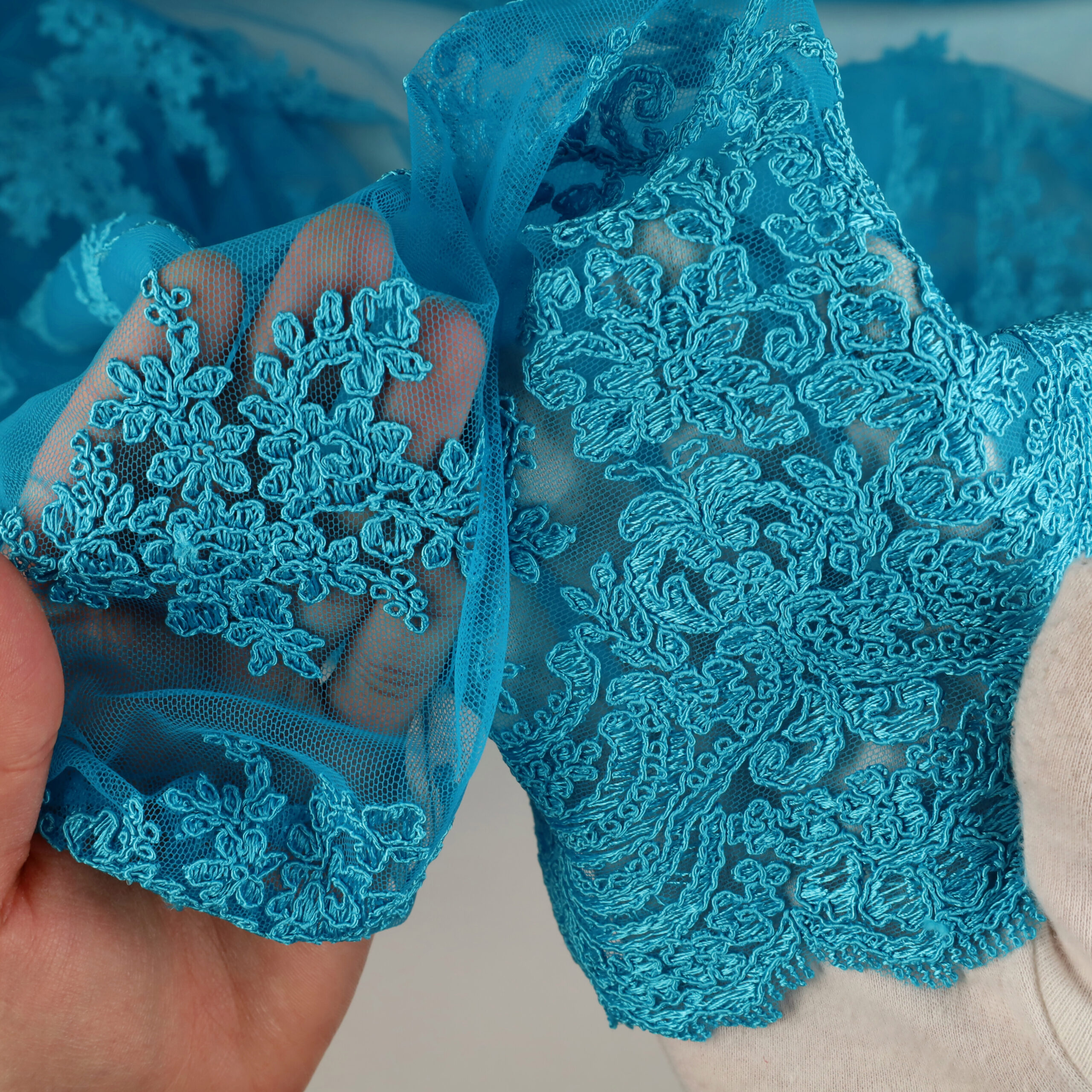 Home Tipi di Tessuto Macramè Pizzo Macramè Pregiato – Fantasia Giglio – al Metro – Turchese
