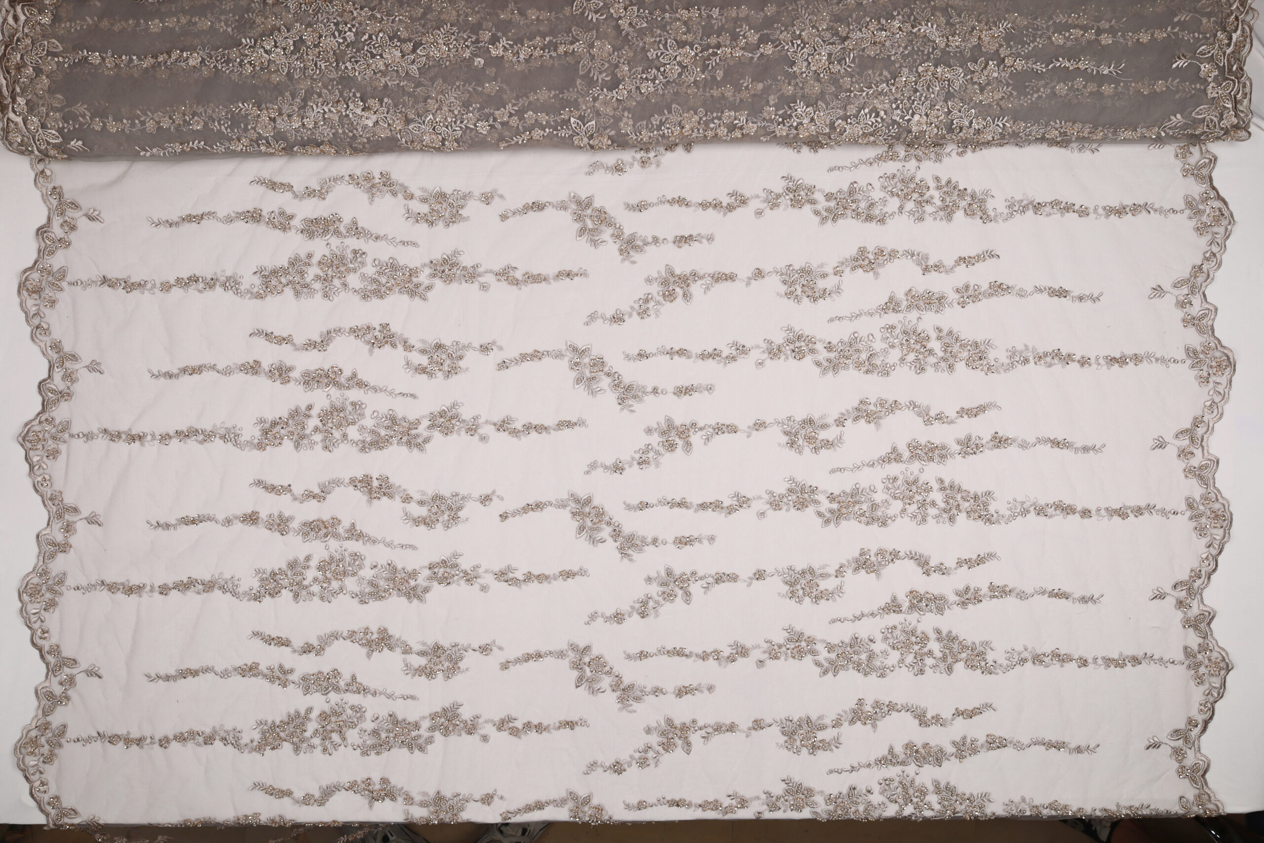 - Utilizzo: Spiccata attitudine per abiti strutturati e sovrapposizioni su basi come raso, mikado o tulle.